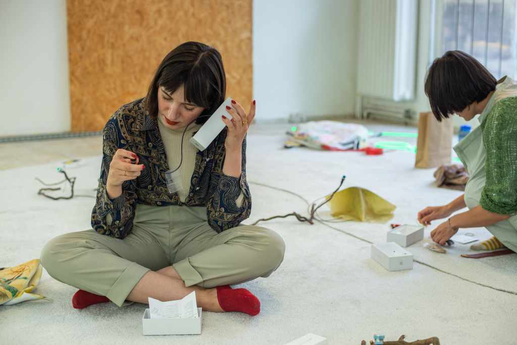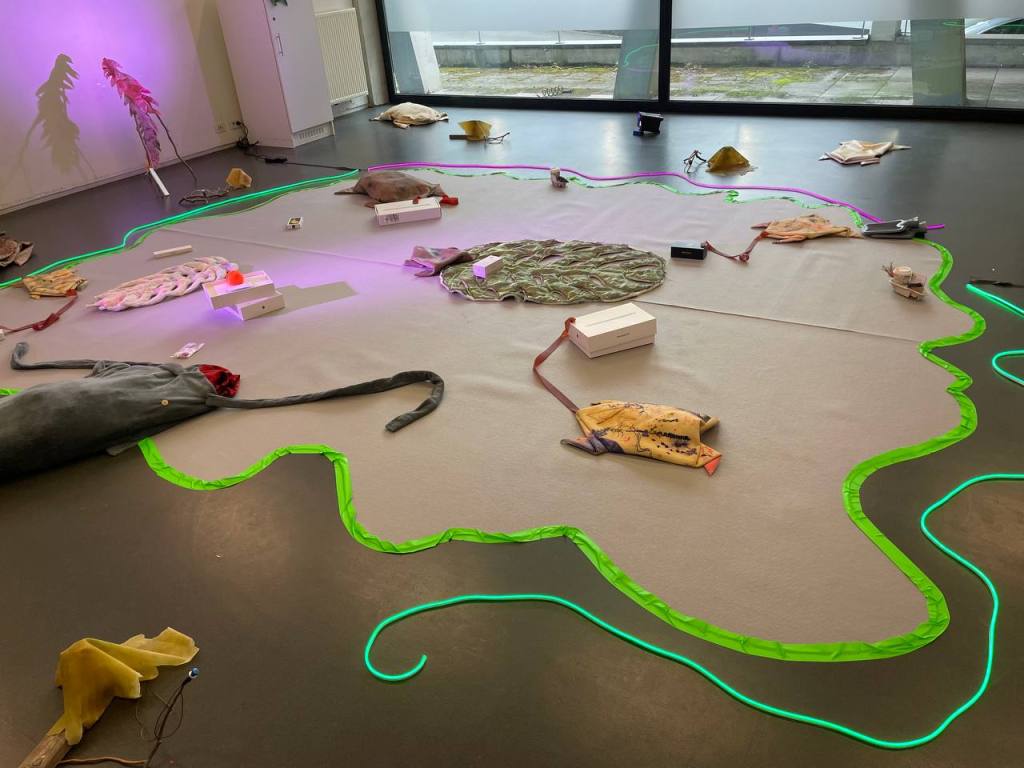 PYL creates a playground where any kind of visitor – a kid, an adult, a dog or its flea – can find a suitable role in the open system. Everyone is invited to forget about rational logic and surf into a new reality composed in collaboration with many meta-pandemic mythological creatures. The space becomes an environment where you can experience a journey passing by a futuristic Talking Swamp (where you cannot drown), encountering a Lonely Orange or an Emotional Plastic Bag. By accepting the terms and conditions of the game, you can discover a sudden transformation of a mobile phone box into a fin of a dolphin and confess your love to Slime (at any moment).