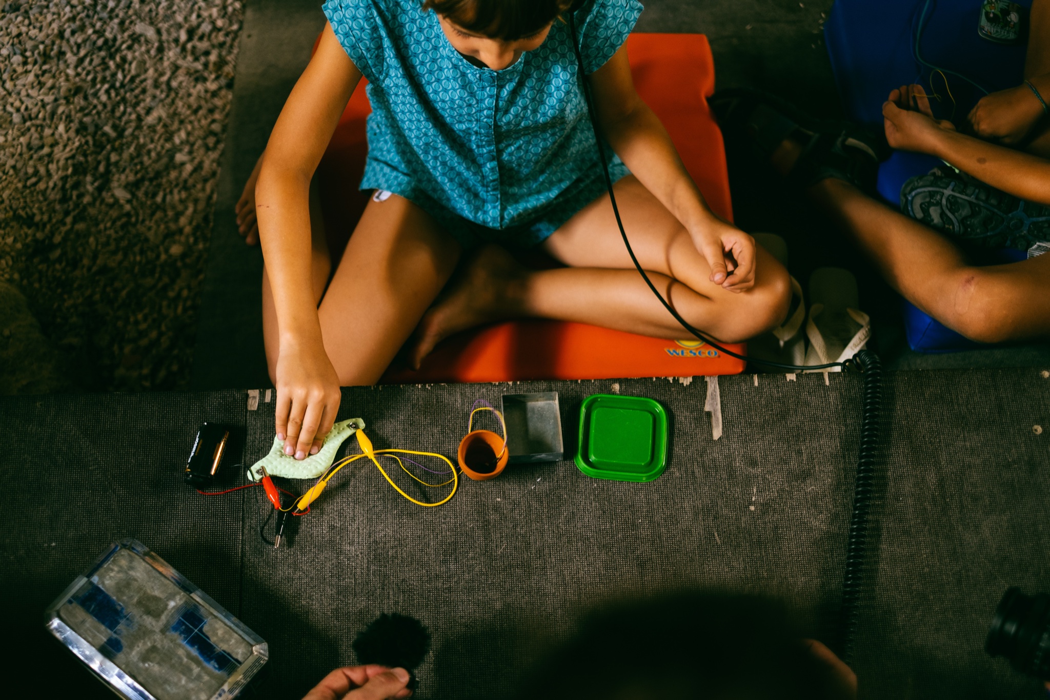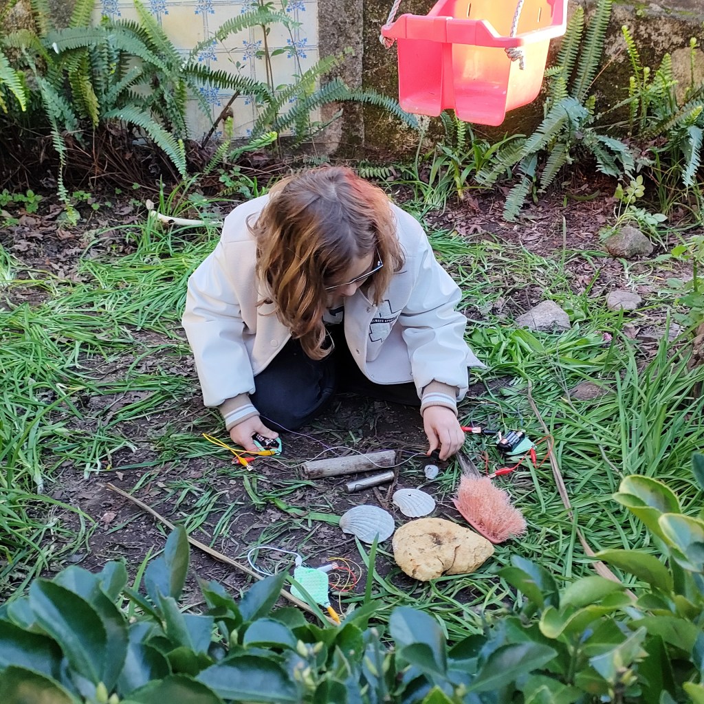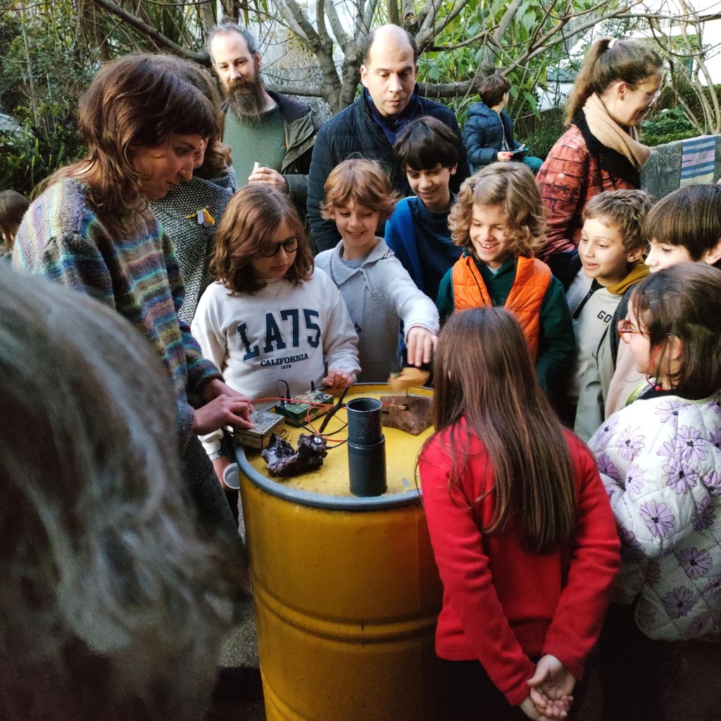 The workshop unfolds through a series of modular exercises. Children build simple instruments using motors, buzzers, and conductive materials, discovering how sound transforms when these elements resonate with different surfaces. In some versions of the workshop, I introduce technology as extension of our ears: microphones and headphones allow participants to listen to their creatures more closely by amplifying their textures.