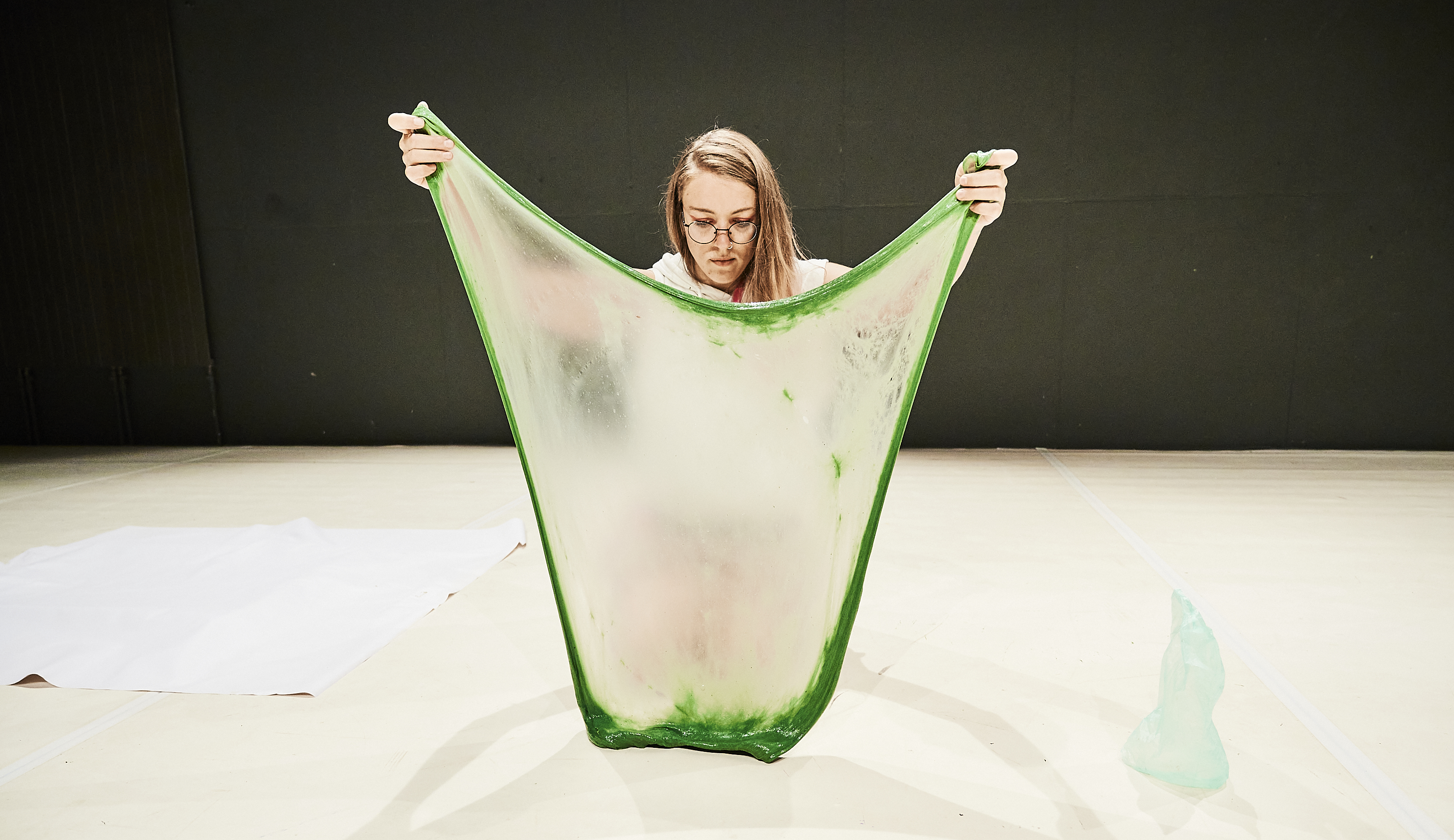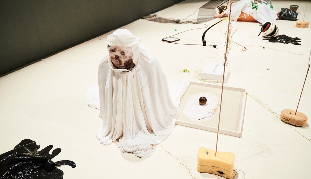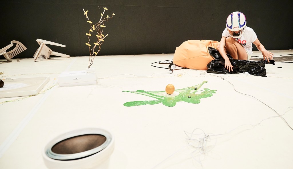 Reality surfing is non-narrative visual performance, which proposes to the audience to experience an alternative model of coexistence of people and inanimate entities. it discovers new relations between daily objects through care and engagement with their materiality. Things gain an equivalent value as human bodies. Scenography of the piece comprises a system which exists and functions according to its own rights. It serves and requires a service; it absorbs and triggers; it’s geometry is meaningless as well as a feeling of destruction. Collective PYL invites the public to forget about rational logic and surf into a new reality composed in collaboration with sponges, oranges, machines, ghosts and other unexpected species.