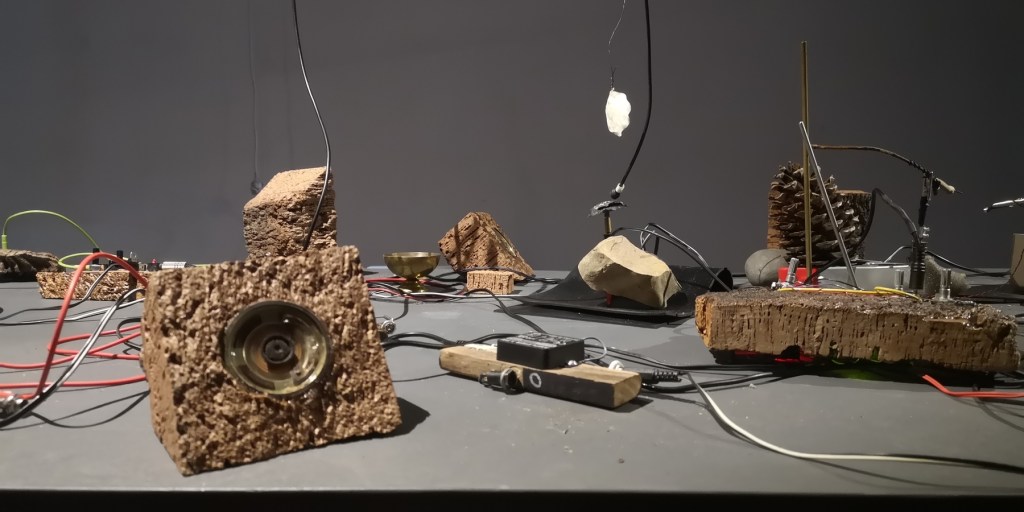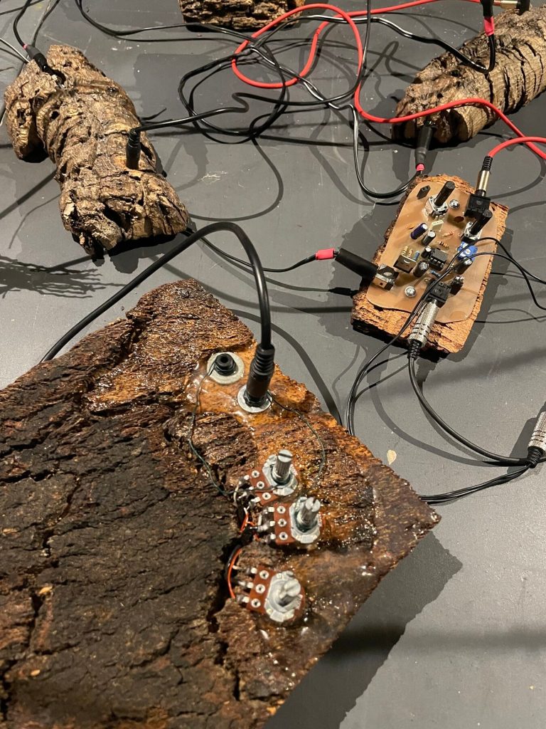 The project emphasizes an economy of listening and music-making, advocating for the use of simple and recycled means – found objects and lo-fi audio equipment. Confronting the imperfections of our chosen materials, we integrate play, failure and joy into our research. we developed a modular multichannel setup consisting of assemblages of electret microphone capsules, amplifier boards and speakers. Its portability allows for what we call “performative roo(u)ting”, meaning an act of moving objects and sound in space. Here we aim to eliminate the use of the omnipresent mixing console and propose a decentralized network of scattered objects, designed for real-time capturing, reproduction and spatialization of sound.